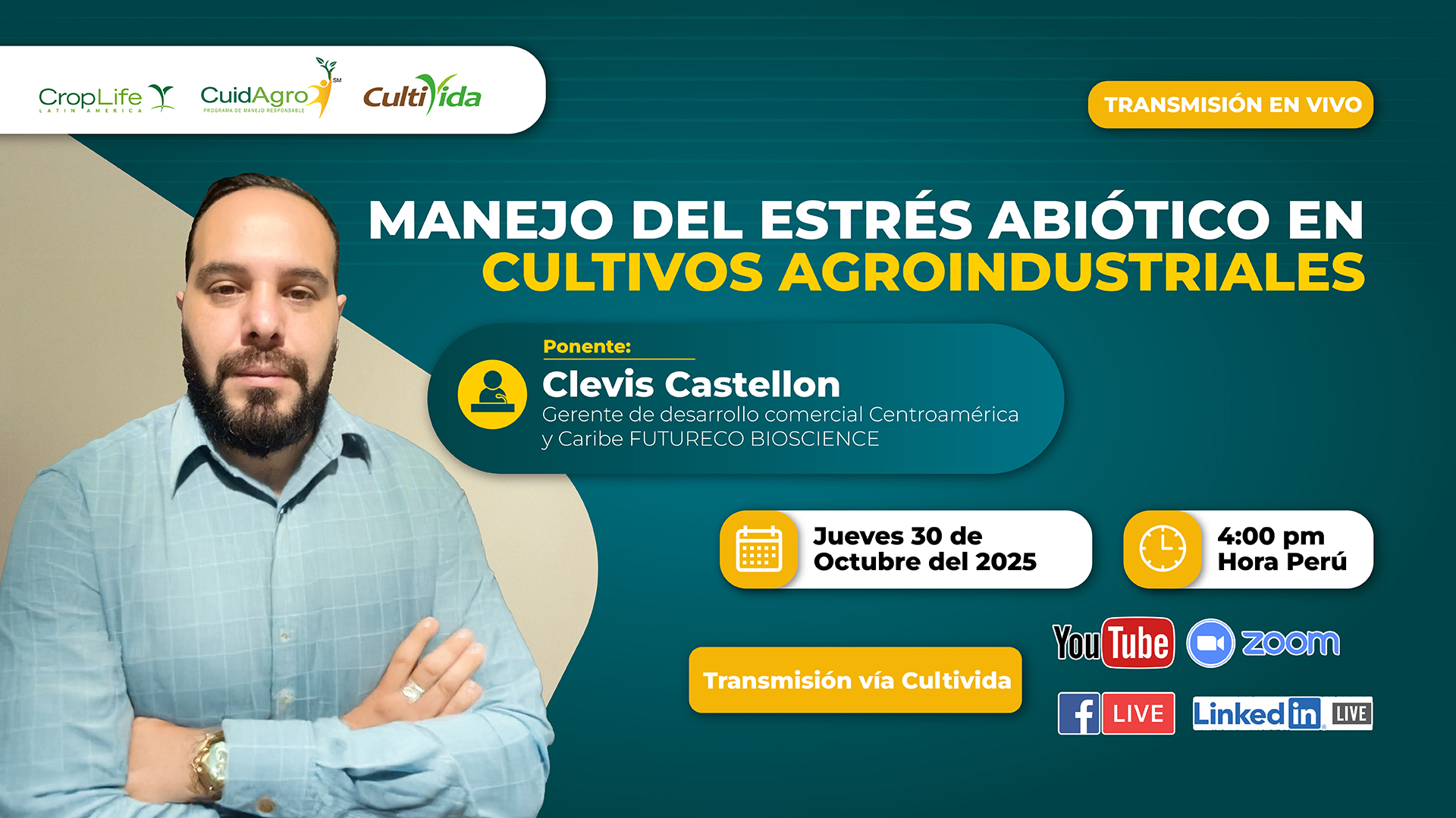 Regístrate en la charla gratuita: WEBINAR GRATUITO: “Manejo del estrés abiótico en cultivos agroindustriales» a cargo de Clevis Castellon, Gerente de Desarrollo comercial Centroamérica y Caribe Futureco Bioscience.