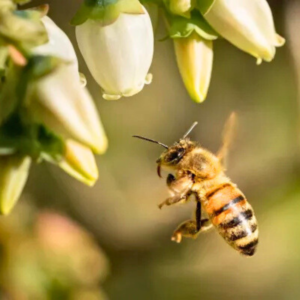 Figura 1: Abeja visitando flores de arándano durante la floración Fuente: Arándanos Perú (27 mayo 2025).